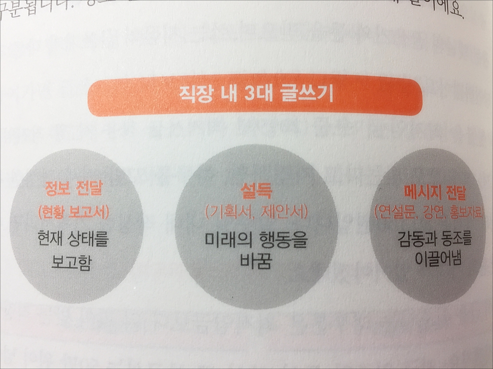 저자가 생각하는 직장에서 하는 3대 글쓰기를 알려 줍니다. 이 중에서 가장 많이 하는 글쓰기는 앞에 두 개가 아닌가 생각이 됩니다. 메시지를 전달하는 연설문, 강연, 홍보자료는 해당 담당자가 아니면 거의 쓸 일이 없지 않을까 합니다. 그렇죠.^^