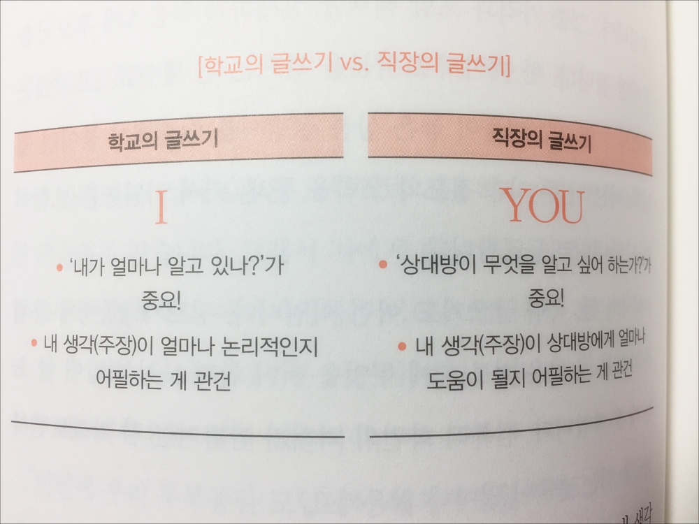 우리가 학교에서 썼던 글들은 '내가 얼마나 알고 있고, 내 주장이 얼마나 논리적인지 어필'을 하는 글이라면 직장의 글쓰기는 '상대방이 무엇을 알고 싶어 하는지, 내 생각이 상대방에게 얼마나 도움이 될지 어필'을 하는 게 관건이라고 두 글쓰기의 차이점을 알려 주고 있습니다.