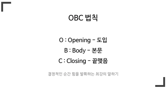 손영주 저자가 알려주는 말 잘하는 팁 중 한가지는 바로 'OBC 법칙' 입니다. 이 법칙은 '서론 / 본론 / 결론'과 비슷한게 아닌가 합니다.