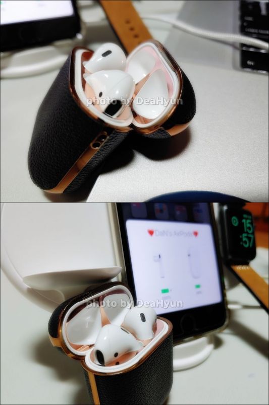 왼쪽은 #게이즈랩 에어팟 가죽 케이스 입니다. 핑크색(로즈골드)도 있었지만 가죽은 역시 블랙!! 그래서 저는 블랙을 선택 했습니다. 대신 AirPods 케이스를 열었을때 보이는 부분에 포인트를 주기 위해 철가루 방지 스티커는 로즈골드로 했지요.^^