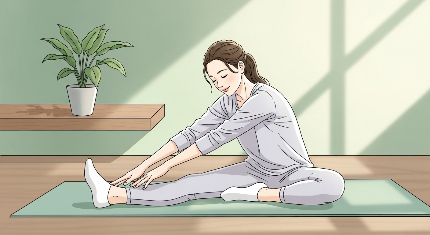 - 하체 스트레칭: 한쪽 다리를 접어 허벅지 앞쪽 늘리기, 앉아서 다리 펴고 발끝 잡기.